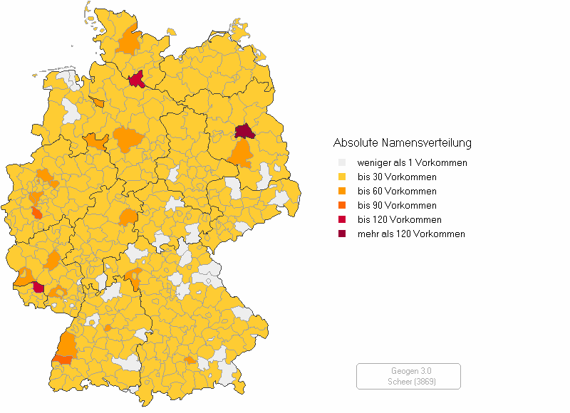Zählt man die Schreibformen Scheer, Schärer, Scheerer, Schehrer usw. hinzu, klettert der Name um einige Ränge nach vorn. Auf der Abbildung rechts ist das Vorkommen der ursprünglichen Namensformen Scheer dargestellt.