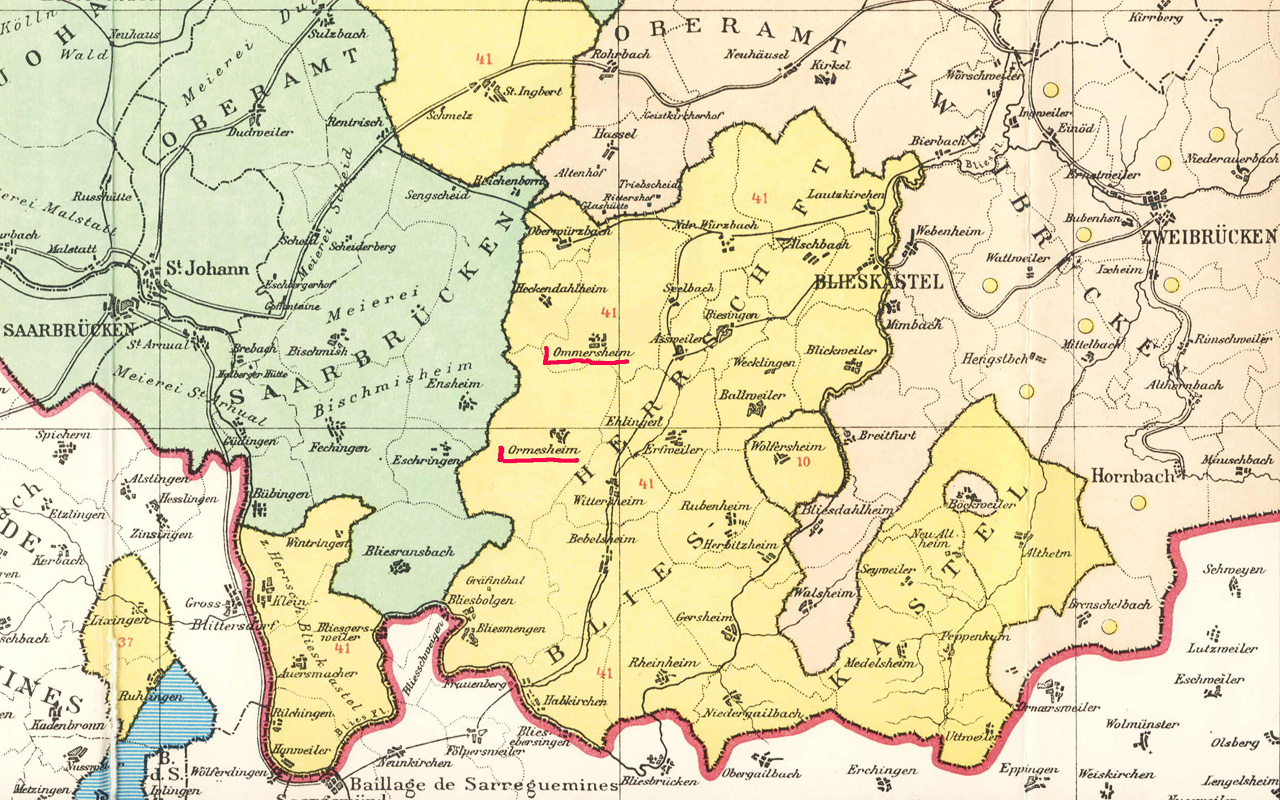 Das Leyen'sche Amt Blieskastel (gelb) mit den Orten Ormesheim und Ommersheim. Ausschnitt aus der historischen Karte "Territoriale Gliederung der Saargegend im Jahre 1789", Beilage zum Buch "Marianne von der Leyen" von Ludwig Eid. |