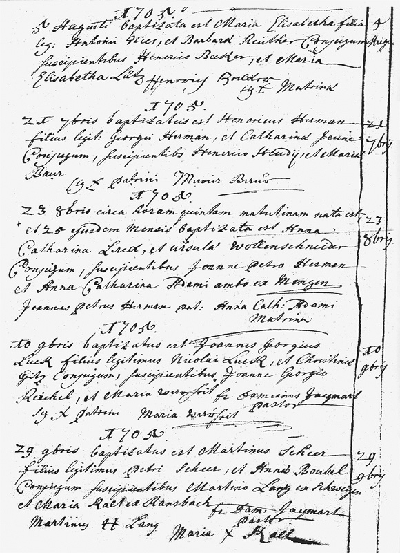 Taufeintrag von Martin Scheer (29.11.1705 Kirchenbuch Bliesransbach, aufbewahrt im Stadtarchiv Saarbrücken). Freie Übersetzung; [1705] am 29. November wurde Martin Scheer getauft, ehelicher Sohn von Peter und Anna Boubel Ehefrau, "sustijisentibus" (sinngemäß etwa über das Taufbecken gehoben = Taufpaten) Martin Lang aus Schweigen (Blies Schweyen) und Maria Kalt aus Ransbach (Bliesransbach) fr.[ater] (Pater) Dam.[ianus] Joymart (aus Wadgassen?) partini |