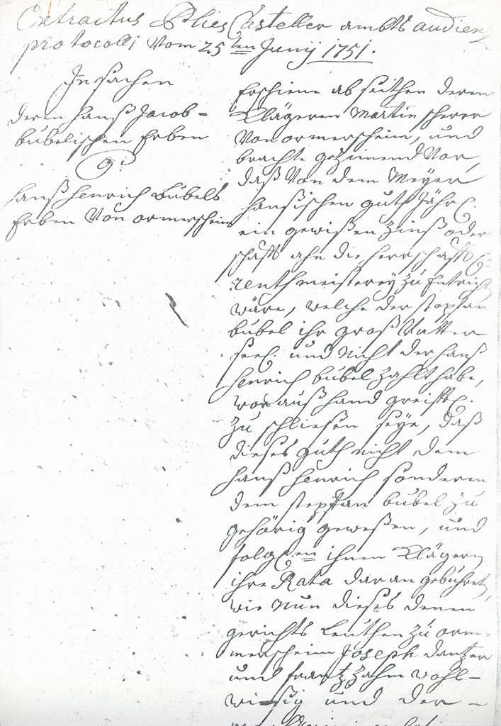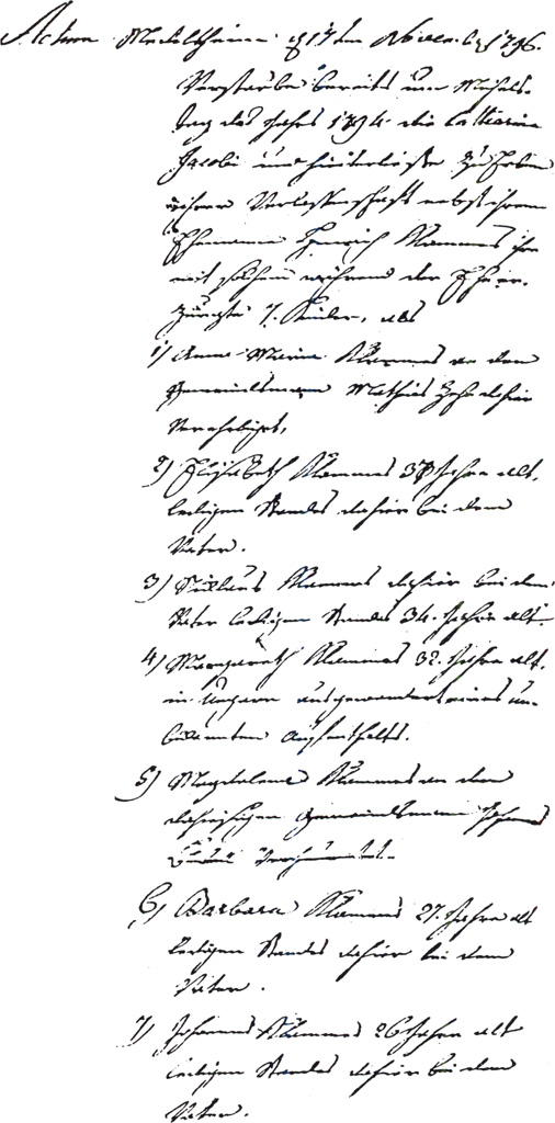 Als ersten gesicherten Vorfahren können wir Johann Peter Scherer betrachten. Sein Sohn Martin Scherer heiratet am 21 Februar 1735 in Ormesheim Anna Gertrud Degel. Bei der Heirat sind keine Eltern beim Brautpaar angegeben. Wir können aber aufgrund einer Zeugenaussage von Martin Scherer diese Lücke schließen. Im Rahmen eines Prozesses (LA Speyer, C 33/181 e) zwischen den Hans Jakob Bubelschen und Hans Heinrich Bubelschen Erben gibt Martin Scherer an, dass sein Großvater Stefan Bubel sei. Dieser Aussage zufolge lässt sich sicher schlussfolgern, dass es sich bei Martins Eltern um Johann Peter Scherer und Anna Bubel, Tochter des Stefan Bubel, handelt. Demzufolge wurde Martin Scherer am 29. November 1705 in Bliesransbach geboren. Taufpaten sind Martin Lang und Maria Kalt, die spätere Ehefrau von Johann Bauer (Baur, Buhr). Martin Scherer und Anna Gertrud Degel haben 10 Kinder, von denen zumindest zwei (Nikolaus und Johann Simon) nach Ungarn auswandern.