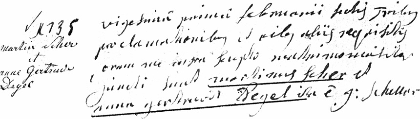 Eintragung der Trauung von Martin Scher (Scherer) und Anna Gertrud Degel am 21. Februar 1735 im Kirchenbuch von Ormesheim. Erste Eintragung am 9.7.1786 und Trauung am 25.2.1794 in Weprowatz. |