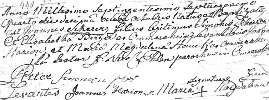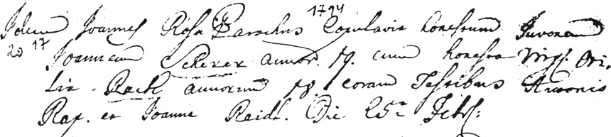 Eintragung der Taufe von Johann Scherer am 18. Oktober 1774 im Kirchenbuch von Ommersheim. Übersetzung der Trauungseintragung: "Der gleiche Joannes Rosa Pfarrer verbindet [traut] ehelich den ehrenhaften Jüngling Joannes Scherer 19 Jahre mit der ehrenhaften Jungfrau Otilie Rack 18 Jahre. Persönlich anwesende Zeugen Antonio Rap und Joanne Reidl. Tag 25. Febr. [1794]." |