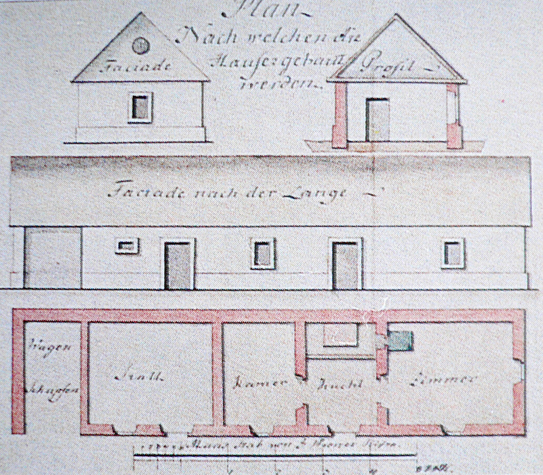So sah das Ansiedlerhaus 64 des Kolonisten Simon Scherer im Jahre 1786 aus. Es stand in der Mittelgasse 133, heute Lenjinova ul. 133 ("Kolonistenhaus", nach Franz Ferch).
