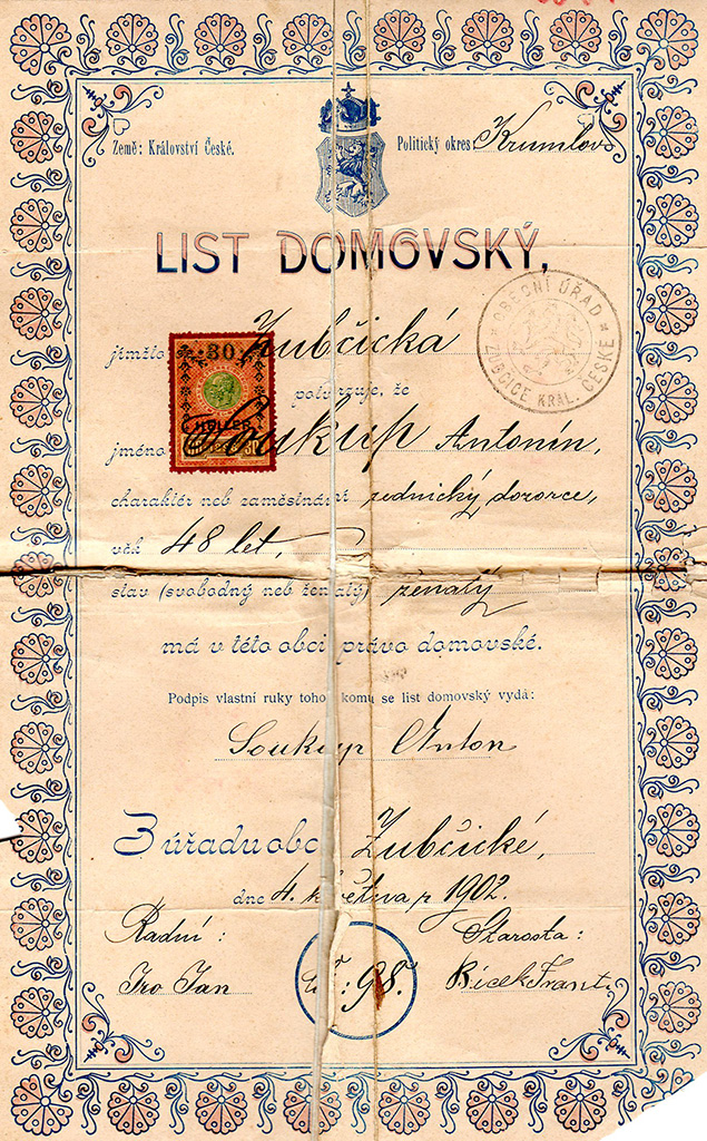 Heimatschein von Anton Soukup für Zubčické (Subschitz, heute Zubčice, südböhmischer Kreis) |