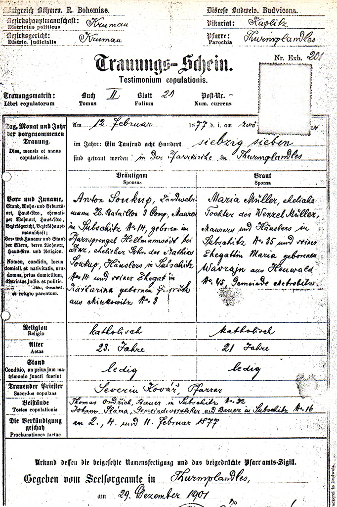 Der älteste bekannte Vorfahre ist Paul Soukup (auch Saukup), der in Paračov heiratet. Der Wortlaut dieser Eintragung im Kirchenbuch lautet: "Dunogicio [Dunovice] die 20. 8bris [1765] contravit Matrimonium per verbade presenti Paulus Saukup Viduus ex Dunogc oriundus [aus Dunovice abstammend] Filius ex Chehnitz cum Sponsa Catharina oriunda Filia dfcti. Mathia Stépanek ex Dunogc Subditi Dominio Štĕknesi praesente me P. Thoma Wirtsch Capell. Loci et cormam Testibus Joanne Worzischek ex Czehnitz Josepho Dunovsky ex Dunogc Catharina Cautmannova ex Dunogc…" (Verkündet 29. 7bris, 6. et 13. 8bris) (Handschriftlicher Vermerk von späterer Hand 11. III. 1940) / Quelle: KB Paračov (Bezirk Strakonice), Band 1, Aufnahme 103. Paul Soukup stammte also aus Dunovice und lebte in Cenice.
