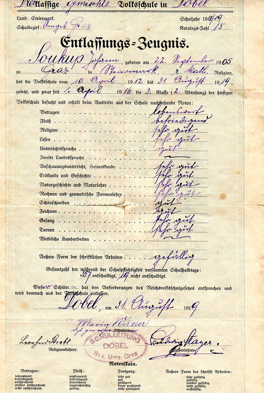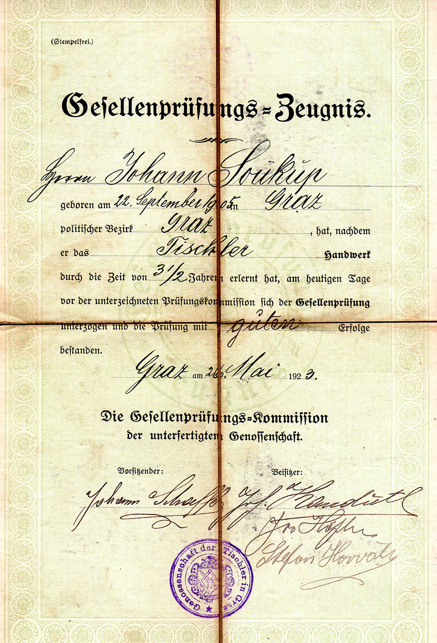 Johann Soukup wurde am 22. September 1905 in Graz geboren und starb dort am 5. April 1988. Zu seinem Vormund wurde sein Großvater Anton Soukup durch das K. und K. Bezirksgericht Umgebung Graz bestellt. In Graz erlernte er auch das Schreinerhandwerk bei der Firma Plommer, wo er bis zu seiner Pensionierung blieb. Am 27. Juni 1936 heiratete er in Graz Josefine Waag, Tochter von Josef Waag und Sabina Stummer aus Windischgarsten. Während des II. Weltkrieges diente Johann als Pionier. 1944 wird in Graz Tochter Heidemarie geboren. Sie heiratet 1965 Paul Scherer, standesamtlich in Karlsruhe und kirchlich in Graz.